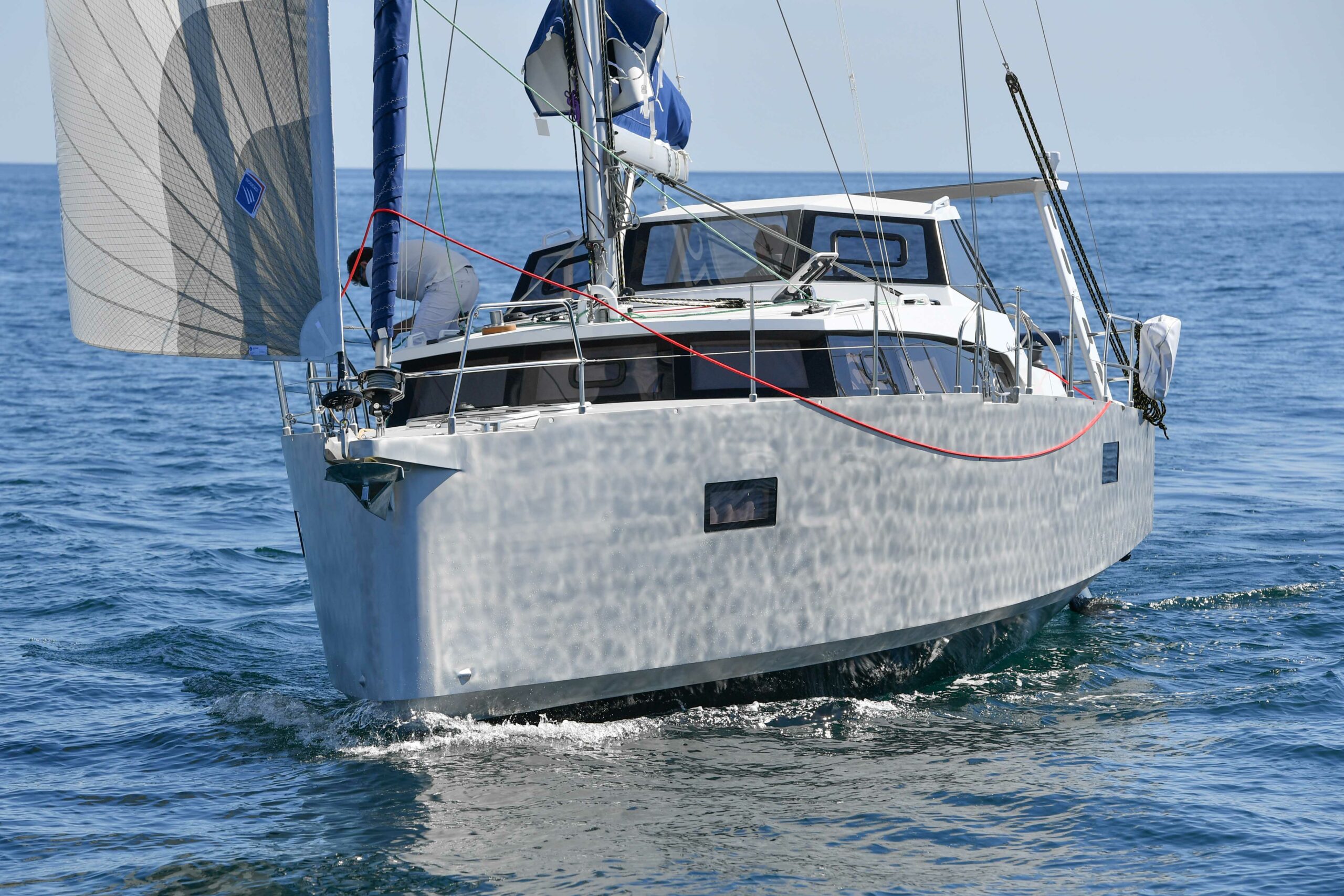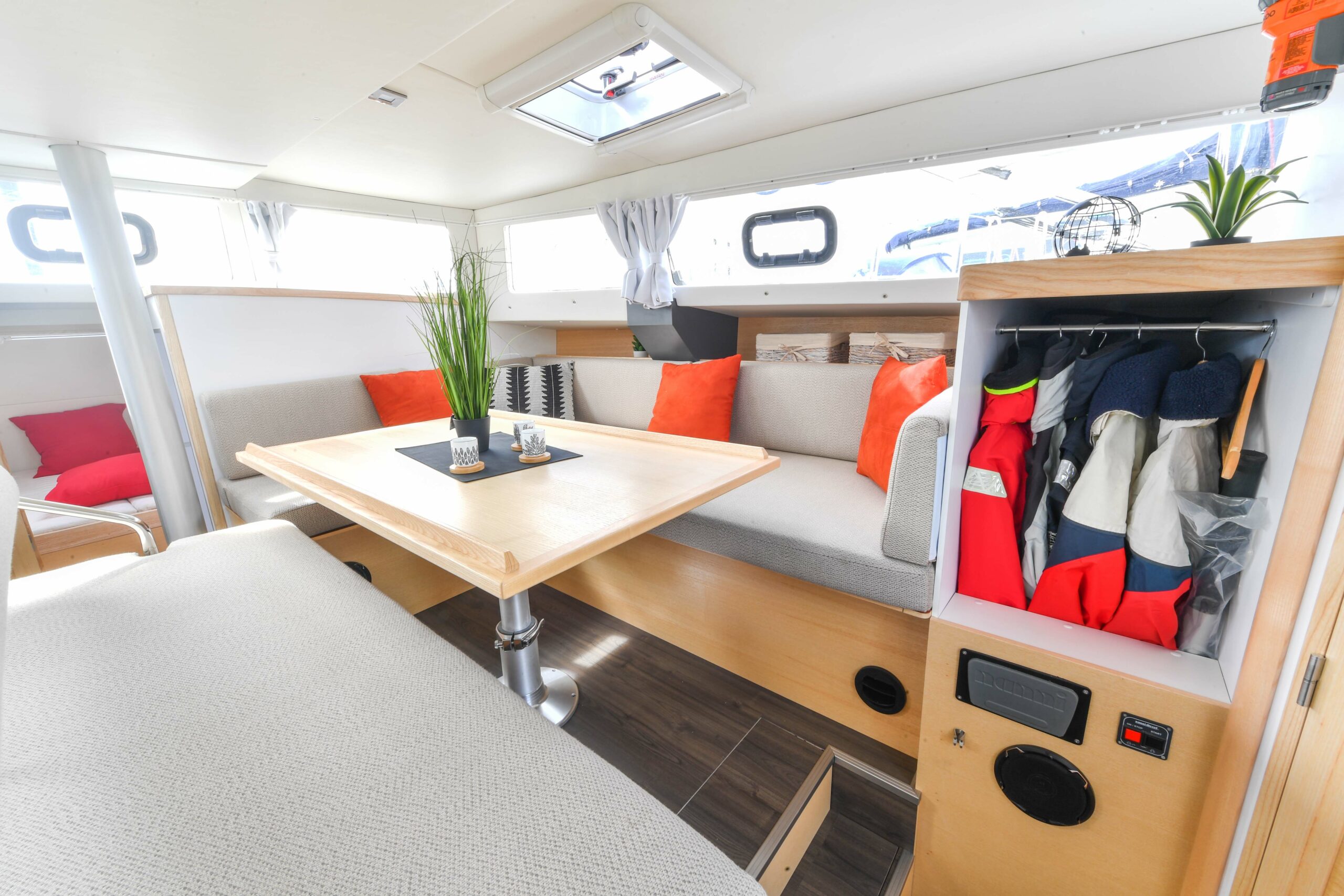 Grâce à sa table à carte surélevée, les veilles peuvent être assurées depuis l’intérieur dans le plus grand confort. Pensé pour une navigation en équipage réduit, toutes les manœuvres sont centralisées au niveau du rouf. La vie à bord est agréable grâce à un carré surélevé et un rouf panoramique qui permettent d’être confortablement installé tout en profitant de l’extérieur. Les nombreux rangements intérieurs et extérieurs ainsi que la soute technique avec un accès facilité aux équipements en font un véritable voilier de grand voyage.